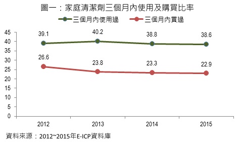 「天然經濟」發酵:家用清潔劑市場全面剖析) 但是東方線上Eicp資料庫在今年發現,家用清潔劑在使用上呈平穩狀態,但在購買比率上,有略為下降。(圖一)
