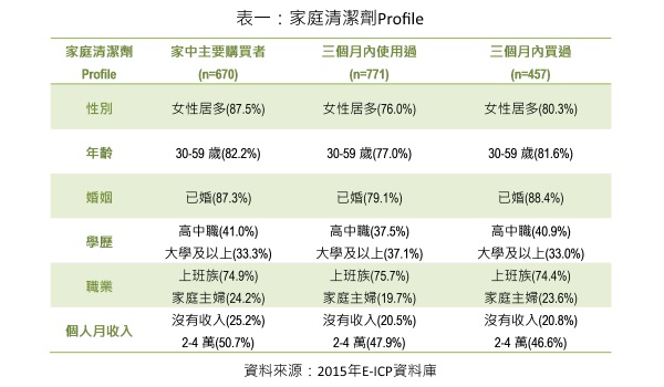 在家庭當中,真正有在使用家庭清潔劑的消費者,往往都會與那穿著圍裙一手家務的母親作上連結。但這樣的數據是否表示購買或使用者的輪廓有小小改變,也許會和我們傳統印象當中的家庭主婦有點不同,繼續用E-ICP資料庫解析家庭清潔劑的User Profile: