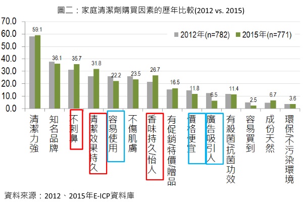 我們可以先從歷年來的整體購買考慮因素來看,從圖二可看出,消費者對於家庭清潔劑的考慮因素在這三年來並沒有劇烈變化,清潔力強是基本訴求不會有太大變動,知名品牌象徵著對產品安心不怕買錯,因此考慮因素的變化多在比較軟性的附加價值上展現。