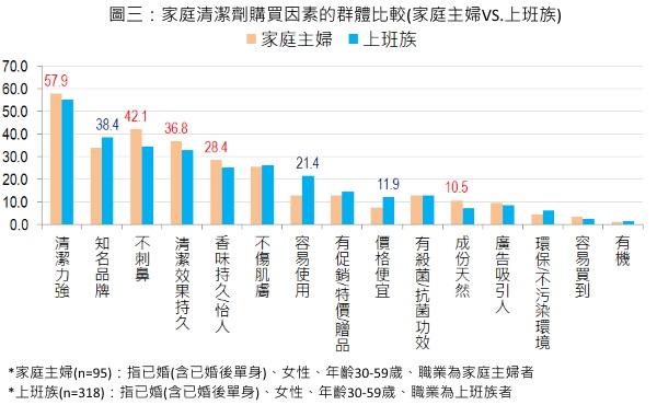 再以家庭主婦與上班族的差異來看購買因素是否有差別,我們從圖三可知,上班族較家庭主婦有強烈需求的部分僅有