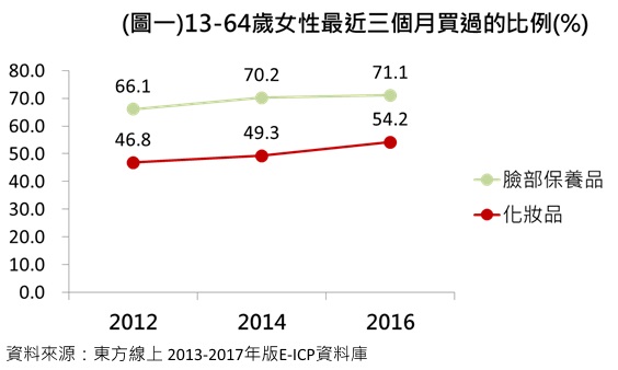 整體趨勢:臉部保養品與化妝品購買率上升 根據東方線上E-ICP資料庫,近年來台灣女性購買臉部保養品的比例呈上升趨勢(圖一),臉部保養品最近三個月的購買率由2012年的66.1%上升至2016年的71.1%,漲幅7.6%。購買化妝品的比例成長更是明顯,化妝品最近三個月的購買率由2012年的46.8%上升至2016年的54.2%,漲幅15.8%。顯示出台灣女性愛美程度越來越高,不僅出門要化得美美的,更勤於保養臉部,渴望擁有白裡透紅的肌膚。