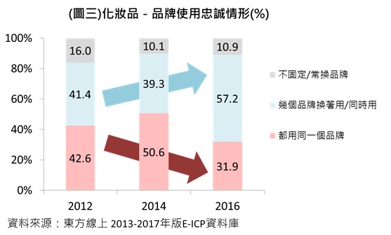 化妝品亦有「品牌聯合國」的現象(圖三),2012年時「都用同一個品牌(42.6%)」的比例稍大於「幾個品牌換著用/同時用(41.4%)」,但至2016年時,「都用同一個品牌」下降至31.9%,反觀「幾個品牌換著用/同時用」則大幅上升至57.2%。一般而言,化妝品的品項多於保養品,一個完整妝容從底妝開始,包括飾底乳、粉底液、遮瑕膏、蜜粉…等,眼妝則有眼影、眼線液、睫毛膏…等,唇彩也有唇膏與唇蜜等。在多品項的情況下,消費者做決策的次數更多,更不易全部忠誠於同品牌的產品,因此化妝品「品牌聯合國」的比例是高於臉部保養品的。