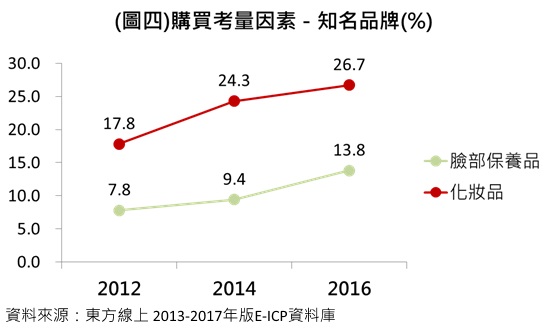 根據東方線上E-ICP資料庫,消費者在選購臉部保養品與化妝品時,考量「知名品牌」的比例呈上升趨勢(圖四),顯示美妝產品的「知名品牌」在消費者心目中重要性逐年增加,是一種品質的保證。因此產品若想進入消費者的口袋名單,打響品牌的知名度才能吸引他們的目光。