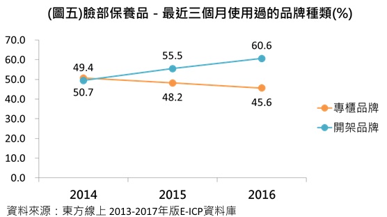 專櫃品牌的危機?開架保養品來勢洶洶! 保養品品牌主要分成兩大種類:專櫃品牌與開架品牌。根據東方線上E-ICP資料庫,2014年時,專櫃品牌與開架品牌勢均力敵(圖五),但近兩年來兩者的差距變得懸殊。截至2016年,專櫃品牌使用率下降至45.6%,開架品牌使用率則上升至60.6%,開架品牌成為保養品最主流的品牌種類。