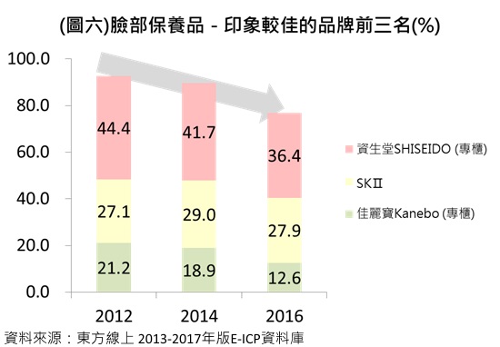 值得注意的是,前三大品牌加總由2012年的92.4%逐年下降至2016年的76.9%也是一大警訊:消費者對專櫃品牌的好印象正在流失當中!