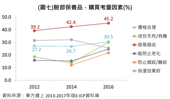 你以為你的消費者還在在乎「保濕效果好」?市場變了真的不能不知道! 除了品牌以外,消費者在選購臉部保養品時,仍有多方面的考量。根據東方線上E-ICP資料庫,消費者最重視保養品「容易吸收」的程度(圖七),畢竟功效再好的保養品若皮膚不能吸收都是空談。