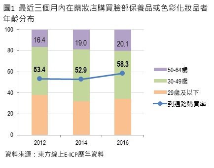 藥妝店: 50-64歲相對占比增加,可能是下一波成長新商機 在藥妝店購買臉部保養品或色彩化妝品的人數比例持續攀升的情況下,以年齡分布中,仍是以30-49歲為主力,但不可忽視的是50-64歲的占比有逐年增加的情況(如圖1),可推斷50-64歲的消費者對於藥妝店的貢獻,可能在未來扮演愈來愈重要的角色。