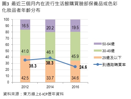 由圖2可以明顯地看到百貨公司消費組成中,購買臉部保養品或色彩化妝品的人數雖整體有減少的態勢,但在百貨公司的消費主力佔比上卻是愈來愈凸顯(2012:50.6% --> 2016:55.2%)。