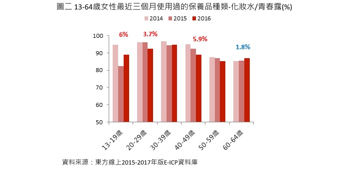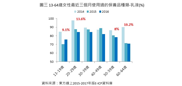 另一方面,13-29歲年輕族群是化妝水及乳液使用比例同時衰退較明顯的族群 (圖二/圖三),13-19歲使用化妝水及乳液的比例分別衰退6%及9.1%,20-29歲則是分別衰退3.7%及13.6%。此外,40-49歲族群化妝水使用率及50-59歲乳液使用率衰退情況也都較全體嚴重。