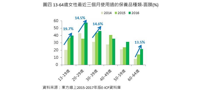 一片美女孩:39歲以下女性,我的保養就是「這 • 一 • 片」 再細看各年齡族群使用面膜的歷年變化比例,幾乎是全年齡對於面膜的接受程度都愈來愈高,且13-39歲年輕族群使用面膜的比例高於全體的增長比例(圖四),面膜成為這年齡層的必備產品。其中13-19歲青少年族群使用面膜比例成長速度最驚人,由2014年20.3% 翻倍成長至2016年40.0%,成長幅度將近100%;20-29歲族群亦由43.0%成長至57.5%,成為近年來面膜使用比例首度超過半數的族群歲族群,看來20-29歲女性的保養之道漸漸從「基礎保養化妝水→乳液」轉變為「一片面膜萬事搞定」了,稱之為「一片美女孩」最成凸顯這群年輕消費者的新興保養特色。