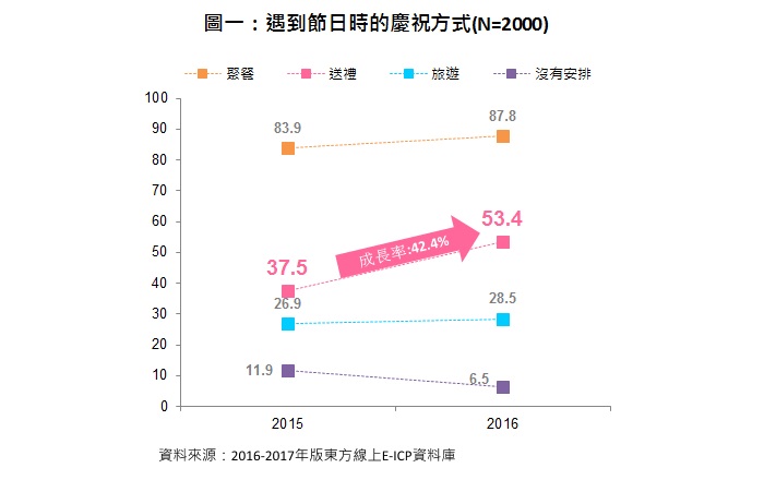 送禮行為值得注意!送禮行為在2015到2016年時的比率增長程度相當高,從37.5%到53.4%,成長率達到42.4%!也就是說,2000人當中就有高達1068人在遇到節日時會選擇送個禮物,用禮物示心意的情況大幅成長!