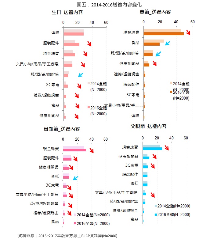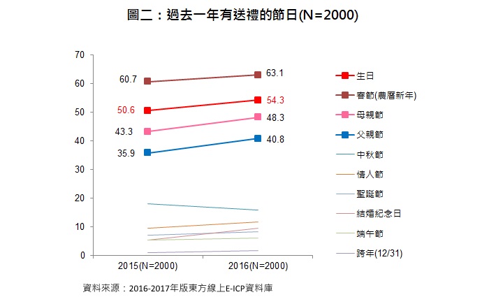 送禮四大節日不可忽視:春節、母親節、父親節、生日 圖二顯示去年有送禮的節日紀錄,東方線上發現,送禮比率最高的節日依序為春節(2016年63.1%)、生日(54.3%)、母親節(48.3%)、父親節(40.8%),此四大節日送禮比率在2016年都為上升趨勢,為最主要的送禮四大節慶。