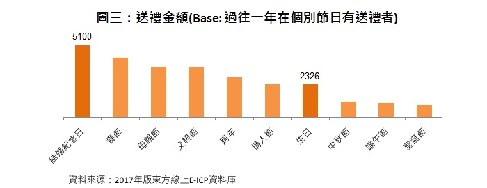 從送禮平均金額來看,花費會最高的是結婚紀念日!在結婚紀念日送禮的人雖然沒有四大節日那樣多(上圖二),但是一出手便是高單價的可能性極高!(高級餐廳是否有隨時做好準備呢?)而生日不像春節、母親節、父親節或結婚紀念日一樣頻次一年一檔,沒有季節跟次數的限制,所以雖然看起來金額較低,但是規模不可忽視。