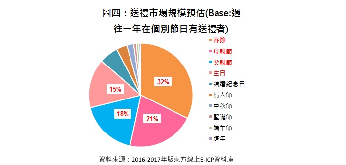 .春節、父親節、母親節:市場規模前三大,單是春節便占去了32%,母親節21%、父親節18%,絕對是禮品市場核心重鎮。