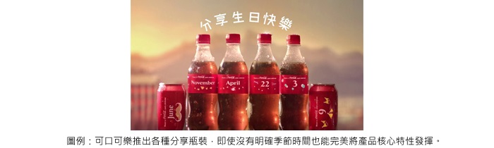 瓶裝可口可樂便是代表性的案例:姓名瓶、緞帶瓶、生日瓶等,不斷推出吸引消費者收集的創意瓶裝:結合品牌「分享快樂」的理念,讓消費者收集到一組生日代碼後,進而分享給友人,共飲可樂的意義更富一層,從此以後和友人慶生、聚會時所需要的飲料,可口可樂都是首選。