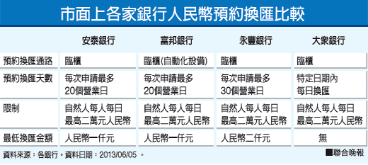 六月艷陽天,三不五時來個午後雷陣雨,頂著高溫跑銀行相當辛苦。今年2月國銀開放以來,著眼較高利率與穩定上揚的匯率,人民幣存款業務仍吸引國人投資目光,國內多家銀行為方便民眾兌換,免於每日換匯上限2萬元人民幣而需要天天跑銀行的奔波之苦,因此推出預約換匯服務,今日安泰銀 (2849)也加入行列,國內目前以永豐金 (2890)旗下永豐銀行可預約30天最多,其餘普遍以20天左右為主,只要民眾設定好換匯日期,貼心幫忙兌換人民幣。