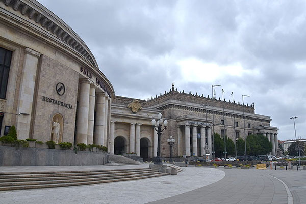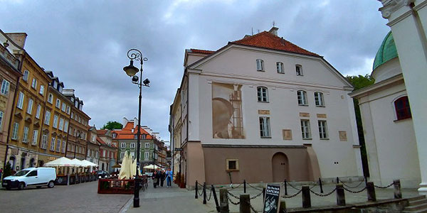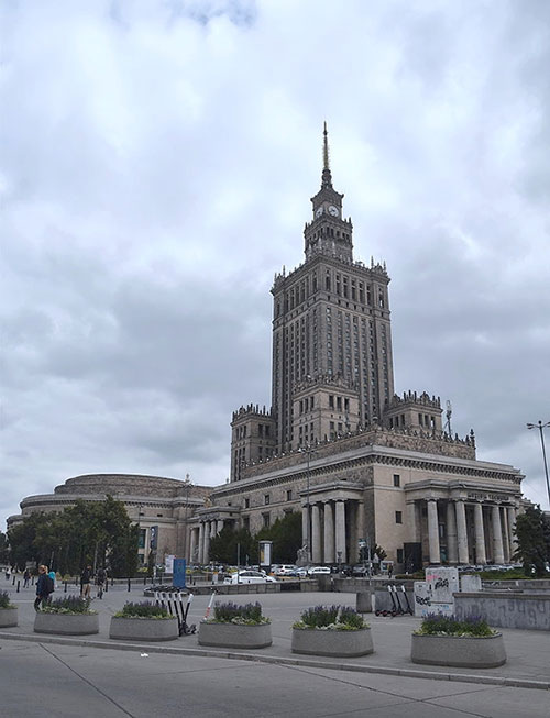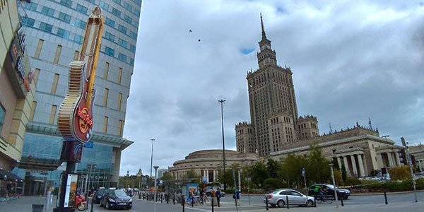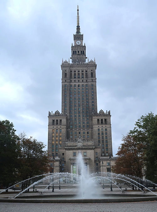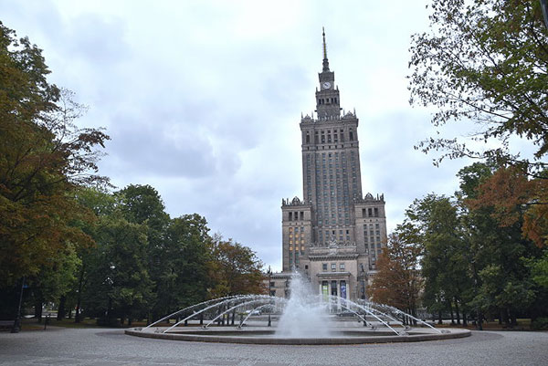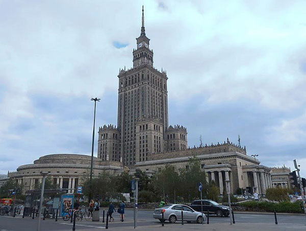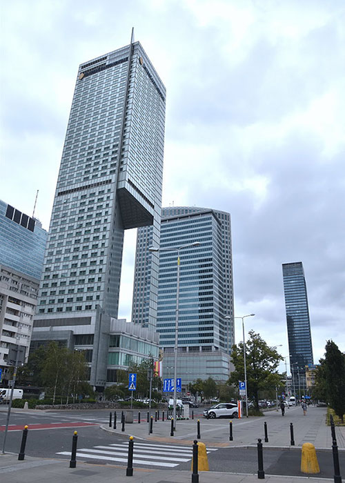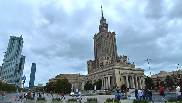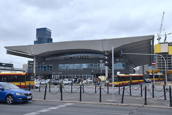 | | 由Zlote Tarasy購物中心望向文化科學宮。 |  | 華沙中央車站(Warszawa Centralna),距離文化科學宮不遠,為波蘭首都華沙市的主要鐵路車站,車站於1972年開工,1975年完工,提供長途列車及國際列車服務。 華沙新城區文化科學宮附近高樓大廈林立,一派現代化大都市景象,故有「東歐小美國」之稱。 一棟大樓的柱牆,上有兒童線畫圖案為裝飾,還有作者簽名與年齡註記,非常用心的設計。