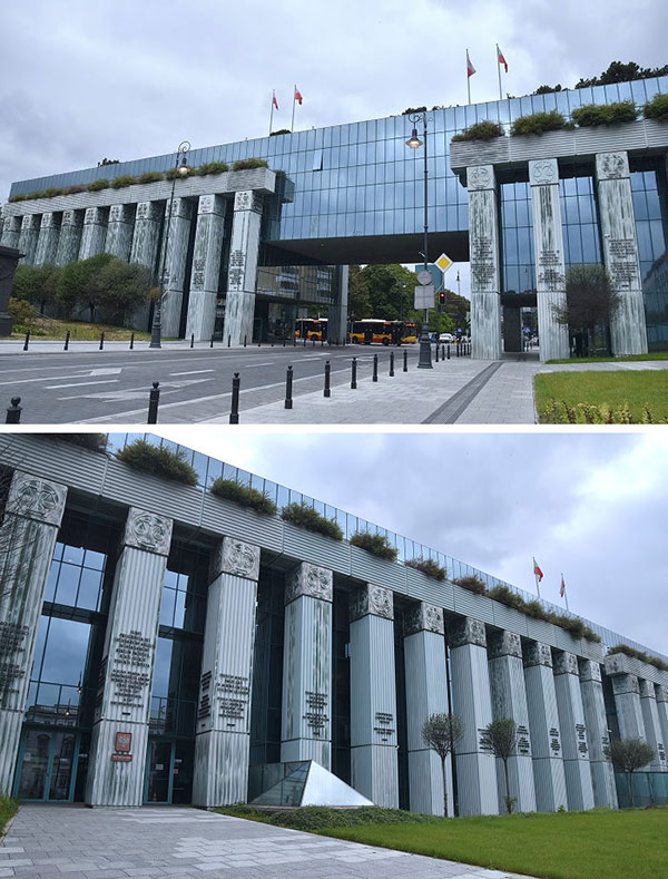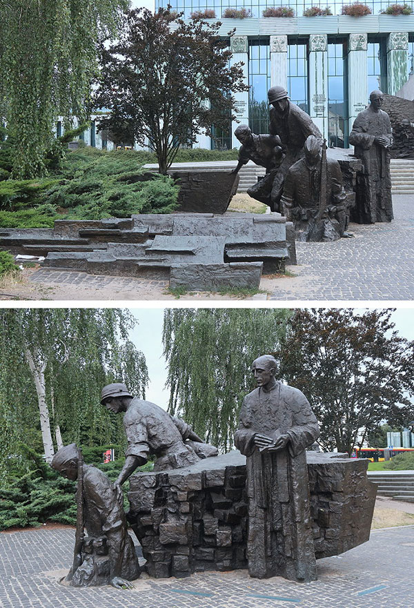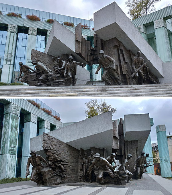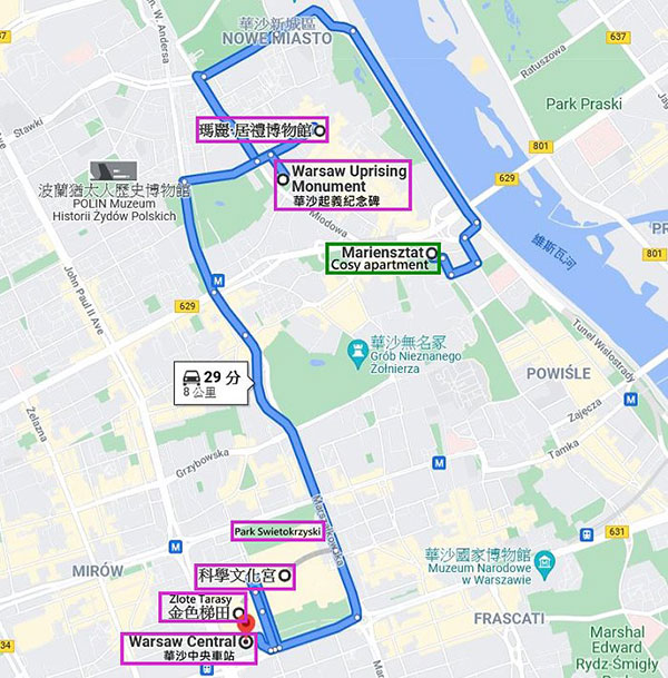 華沙新城區(New Town),又稱為「諾為密亞斯托(Nowe Miasto)」,是華沙的一個街區,歷史可以追溯到15世紀,位於華沙老城以北,通過弗萊塔街 (Freta Street)相連。與華沙老城一樣,新城區毀於第二次世界大戰中納粹戰火,於戰後重建;華沙在二戰後浴火重生,不論城市景觀或內在精神的表現,呈現出新與舊、現代與古老的融合,以快速重建證明其民族性的生命力和韌性,成了復國不屈精神的代表,涅槃重生鑄就輝煌榮光。 這天早上要離開華沙之前,本來決定車遊新城區的知名景點,然後就經羅茲(Lodz)再一路往南駛向克拉科夫(Krakow),後來還是忍不住停車下來,隨手拍幾張掠影。 車子從位在老城區地住宿處駛往新城區,行至弗萊塔街 (Freta Street),這裡在店家開始營業就成了徒步街,但早上未開店時就可行車通過,順路來到聖海耶辛教堂(St. Hyacinth Basilica)。 弗萊塔街 (Freta Street)上有多間藝廊和餐廳,圖為餐廳外牆壁畫。 熟悉的建築有多人等在門口,這棟就是位於弗萊塔街的「瑪麗·居里博物館」。 瑪麗·居里博物館(Muzeum Marii Skłodowskiej-Curie),原是Kamienica Łyszkiewicza公寓,因偉大的科學家瑪麗.居禮曾居住於此而成立其博物館,展出其生平與影像資料。 克拉辛斯基廣場(Krasiński Square),廣場的地標包括:華沙起義紀念碑、波蘭最高法院大樓、克拉辛斯基宮和波蘭軍隊主教座堂。將車子停在克拉辛斯基廣場附近,步行來到華沙起義紀念碑。 華沙起義紀念碑(Monument to the Warsaw uprising)。二戰末期,蘇聯軍隊迫使德軍節節敗退,很快迫近華沙。當時的華沙市民組織「家鄉軍(Armia Krajowa)」地下軍團, 於1944年8月1日實行起義,抗擊德軍。起義的初期曾使市中心一度得以解放,但蘇軍由於政治軍事上諸多原因,軍隊暫停駐在維斯瓦河對岸就不再前進。起義由於失去援軍而節節敗退,持續時間只有63天,1944年10月2日華沙起義宣告失敗,1.8萬抵抗戰士和25萬波蘭平民在戰鬥中喪生,30多萬人被送進集中營。之後,希特勒命令德軍摧毀華沙,經過狂轟猛炸的華沙城區近乎全毀。華沙起義的意義在戰後被淡化多年,直到 1988 年 4 月 12 日波蘭共產黨政府最終於批准建造這座紀念碑,於 1989 年 8 月 1 日起義 45 週年紀念日揭幕,獻給為華沙戰鬥不懈的家鄉軍(資料參考網路)。 華沙起義紀念碑為青銅製成,高約10公尺,是波蘭雕塑家文岑蒂·庫奇馬 (Wincenty Kućma) 和建築師傑克·布迪 (Jacek Budyn) 合作設計完成。紀念碑由二組人物群像構成:較少的人物群組名為「出埃及記(Exodus)」,內容是地下軍人員正在進到下水道口,一旁的牧師正憂心忡忡的注視著。呈現起義期間,家鄉軍使用華沙的下水道系統,穿越德國控制的領土之情境。 較多人物的大群組名為「叛亂分子(Insurgents)」:一群積極參與戰鬥的地下軍的身後是傾倒的方柱和樓板,起義者持槍荷彈從倒塌的建築物出發,準備衝鋒陷陣。以抽象的概念內容傳達波蘭國家大廈將傾,家鄉軍成員力圖奮起支撐。 華沙起義紀念碑旁是波蘭最高法院大樓的列柱,從波蘭最高法院大樓延伸至華沙起義紀念碑這側成L型排列,在紀念碑這側柱頭圖案,是由「PW」二字母結合成錨狀的圖樣。 Powstanie Warszawskie 1944──1944年華沙起義紀念牆。