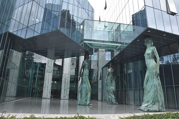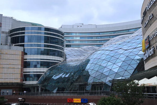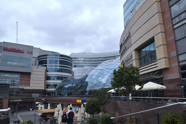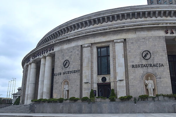 圖中右棟↑是設在科學文化宮附屬建築的華沙旅遊服務中心(Warsaw Tourist Information)。 文化科學宮圓廳外牆上壁龕立有多位波蘭文化、科學界的名家。 金色梯田(Zlote Tarasy)購物中心,位於文化科學宮對面,於2007年開幕。這棟建築是由國際知名的設計公司捷得建築師事務(The Jerde Partnership)執行設計,耗資超過 2 億歐元打造,結合了商店、餐廳、飯店、電影院、停車場等多重功能的休閒與購物中心。 Tarasy正面的大型波浪狀玻璃屋頂是該建築的一大特色,設計用於避免積雪及過濾陽光,其特殊的造型讓金色梯田得到「泡泡商場」的暱稱,閃亮的波浪形玻璃與周圍的簡樸城市景觀形成對比,已經成為華沙的新地標。